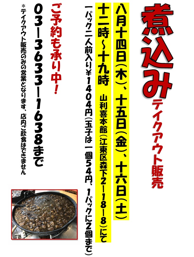 また、14日(木)より16日(土)の3日間、山利喜本館にて煮込みのテイクアウト販売をいたします。